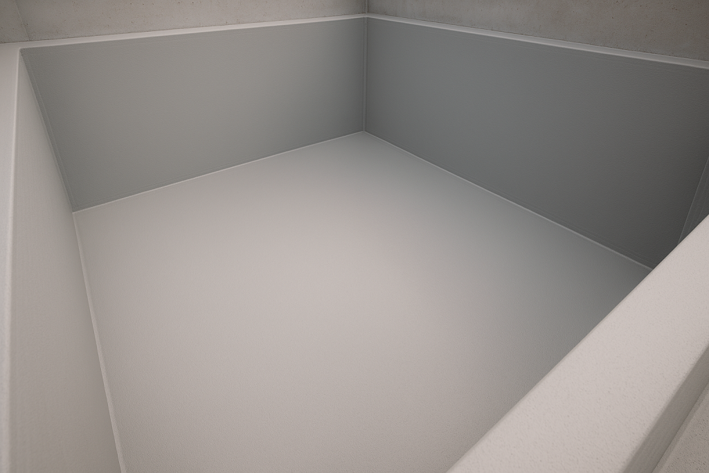 Bazin perfect etanș, cu membrană continuă pe toate suprafețele. Întreținere minimă: se spală ușor, fără zone de reținere.