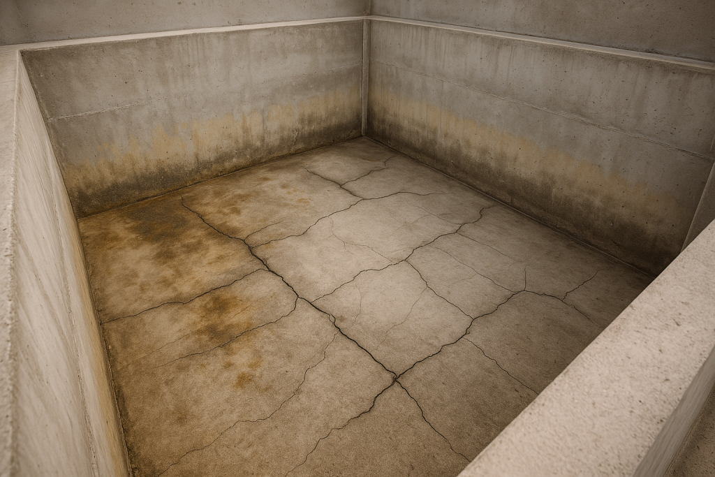 Bazinul prezenta fisuri pe pardoseală și pete pe pereți. Apa se infiltra prin micro-fisuri și prin îmbinările vechi.