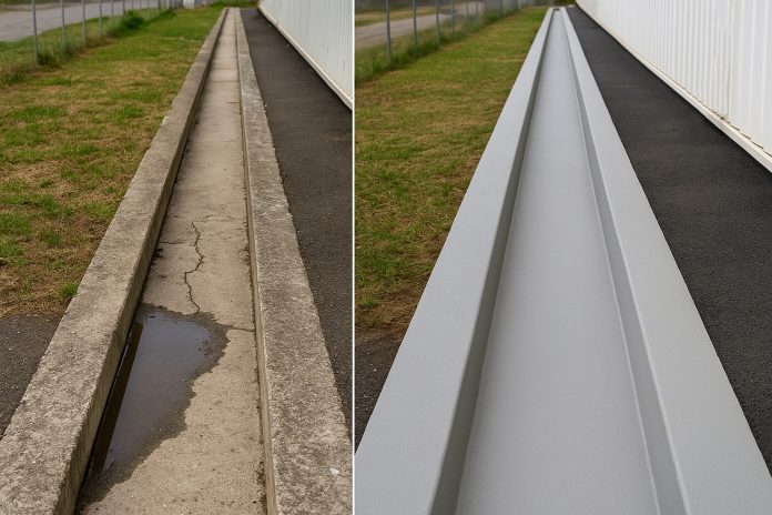 Rigola a devenit perfect etanșă, cu finisaj uniform gri deschis. Apa se scurge corect, fără infiltrații în beton, iar curățarea periodică e simplă.