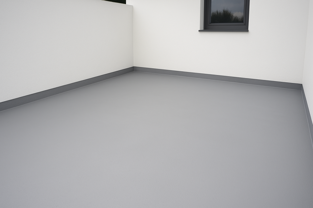 Curățare și uscare, amorsă compatibilă, armare la colțuri și trecerea de scurgere. Aplicare poliuree pulverizată în 2 straturi pe toată suprafața, urmată de topcoat UV cu agregat antiderapant pentru trafic pietonal.
