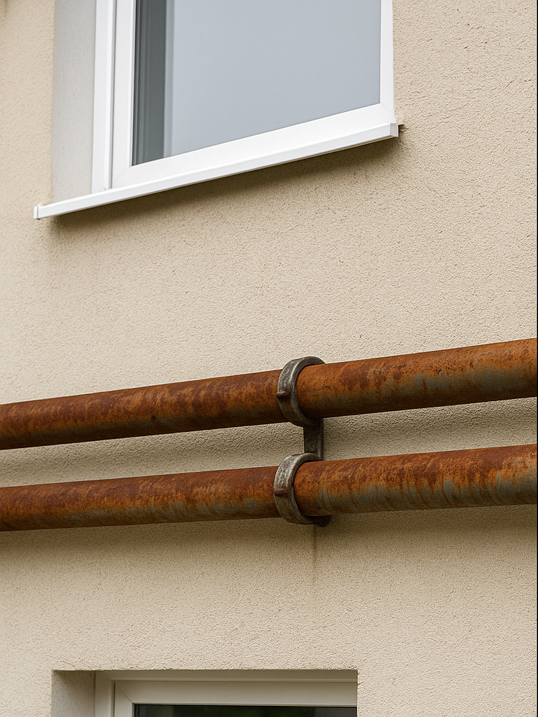 Țevi exterioare cu rugină, izolație veche ruptă, scurgeri la îmbinări. Radiația solară și ploaia au degradat materialele, crescând pierderile de căldură și apariția condensului în zonele reci.