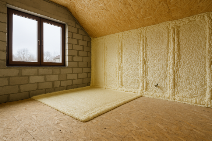 Aplicare spumă poliuretanică cu celulă închisă pe pereții exteriori (din interior, între montanți), apoi pe planșeul podului. Am lucrat în două treceri pentru controlul grosimii și am etanșat complet zonele critice (colțuri, traversări, plinte).